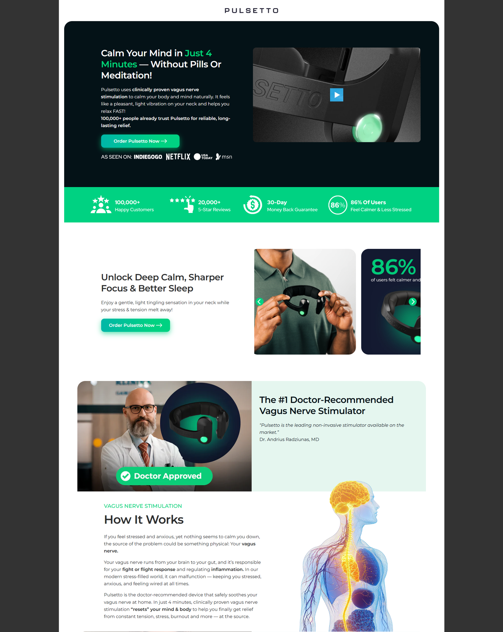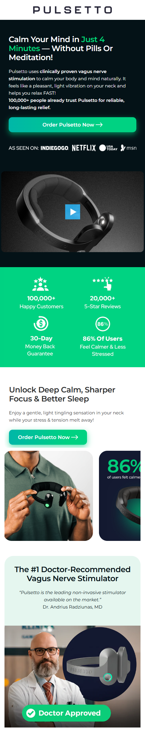 This content follows Google Ads guidelines by not presenting Pulsetto as a medical device intended to diagnose, treat, or cure specific medical conditions. It is presented as a personal wellness tool. Users with pre-existing medical conditions (such as pacemakers or epilepsy) are strongly advised to consult with a physician before using any electrical stimulation device.